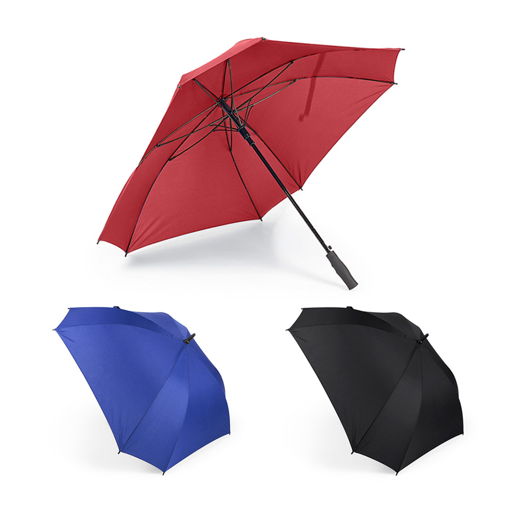 Paraguas cuadrado tipo Golf de 27'' cons sistema de apertura automática, 8 castos, marco completo y costillas en fibra de vidrio, mango en ABS con acabado de caucho, pongee 190t, Antibrisa.